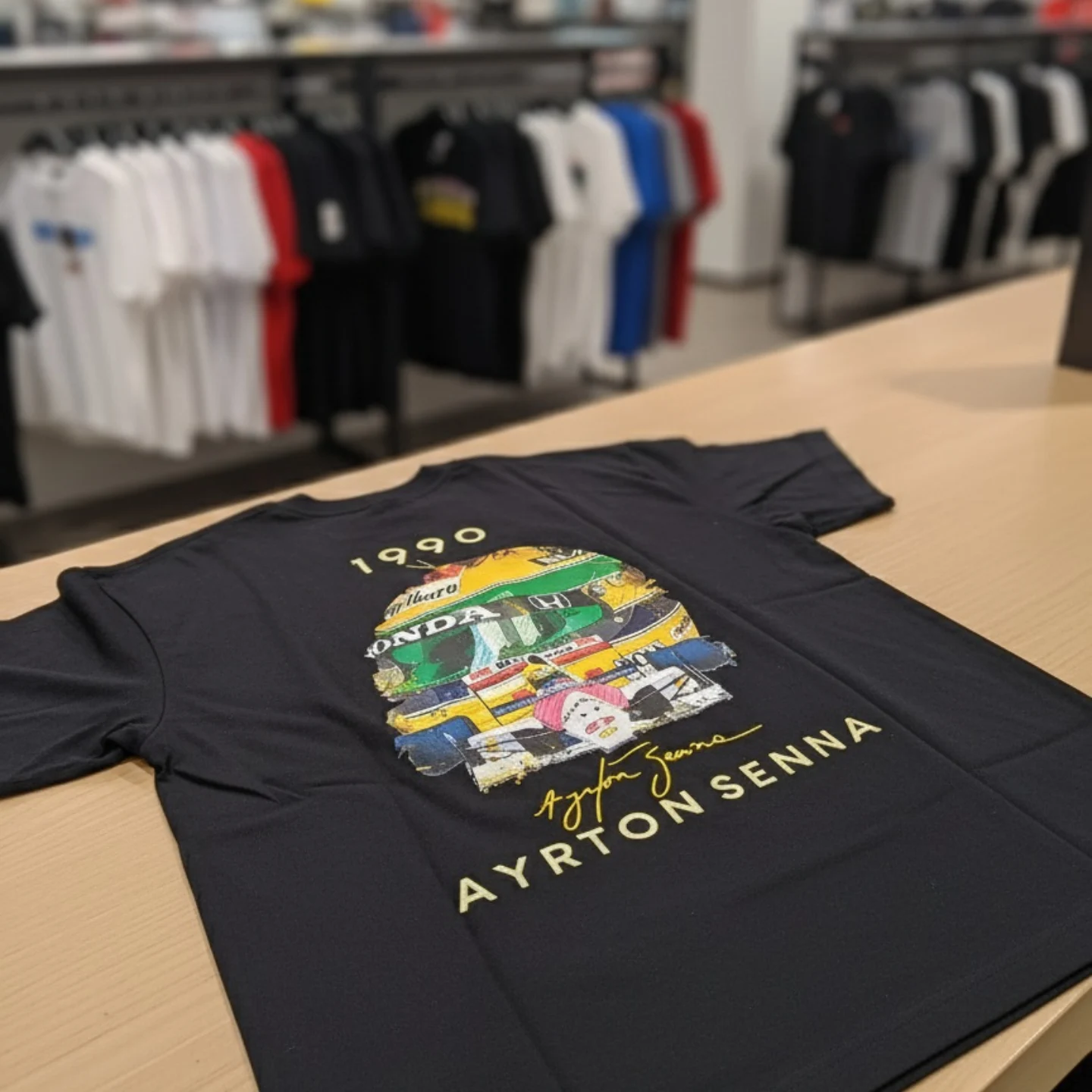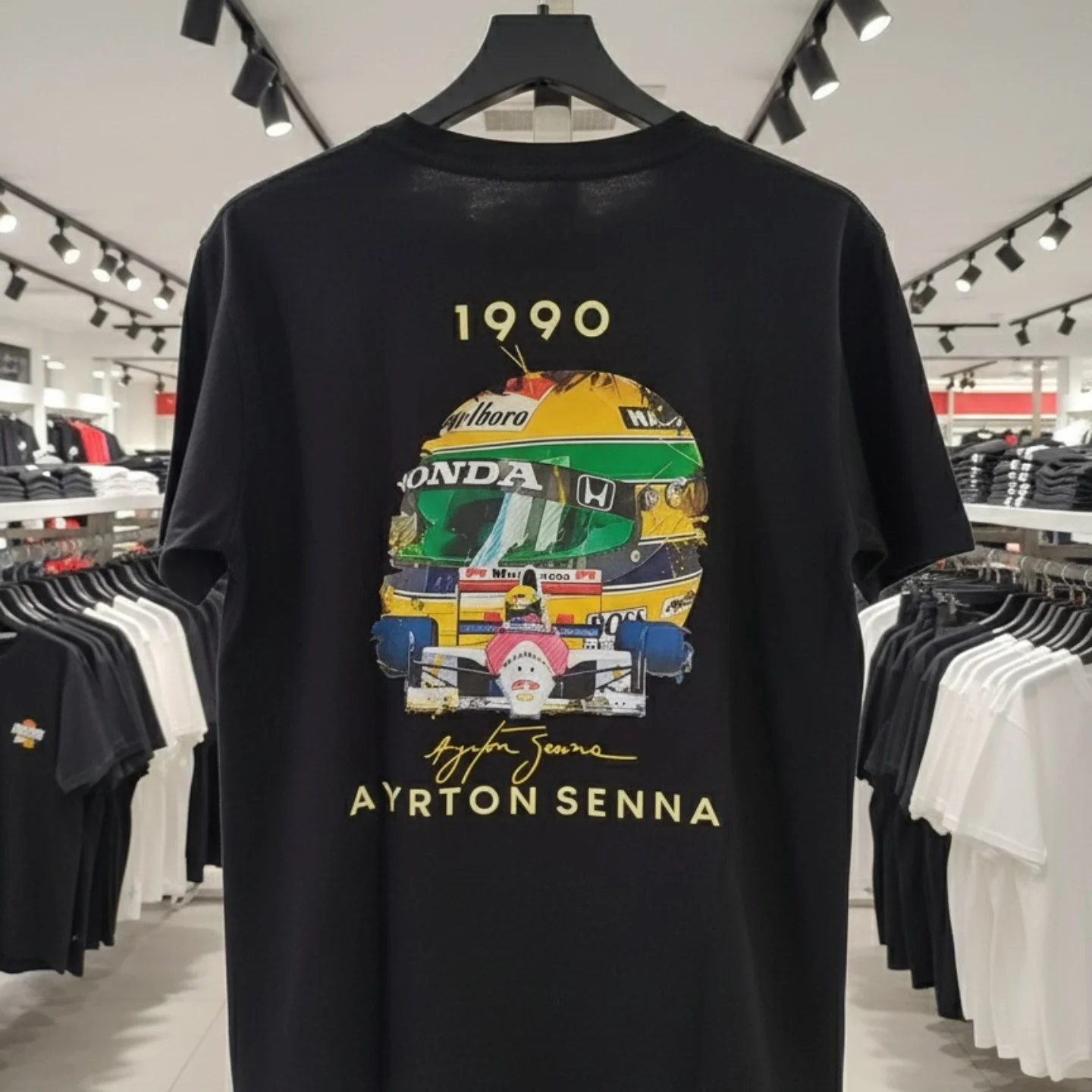 Esta camiseta exclusiva traz a arte detalhada do capacete e do carro de Ayrton Senna da temporada de 1990. Um verdadeiro item de coleção para fãs e apaixonados por velocidade.