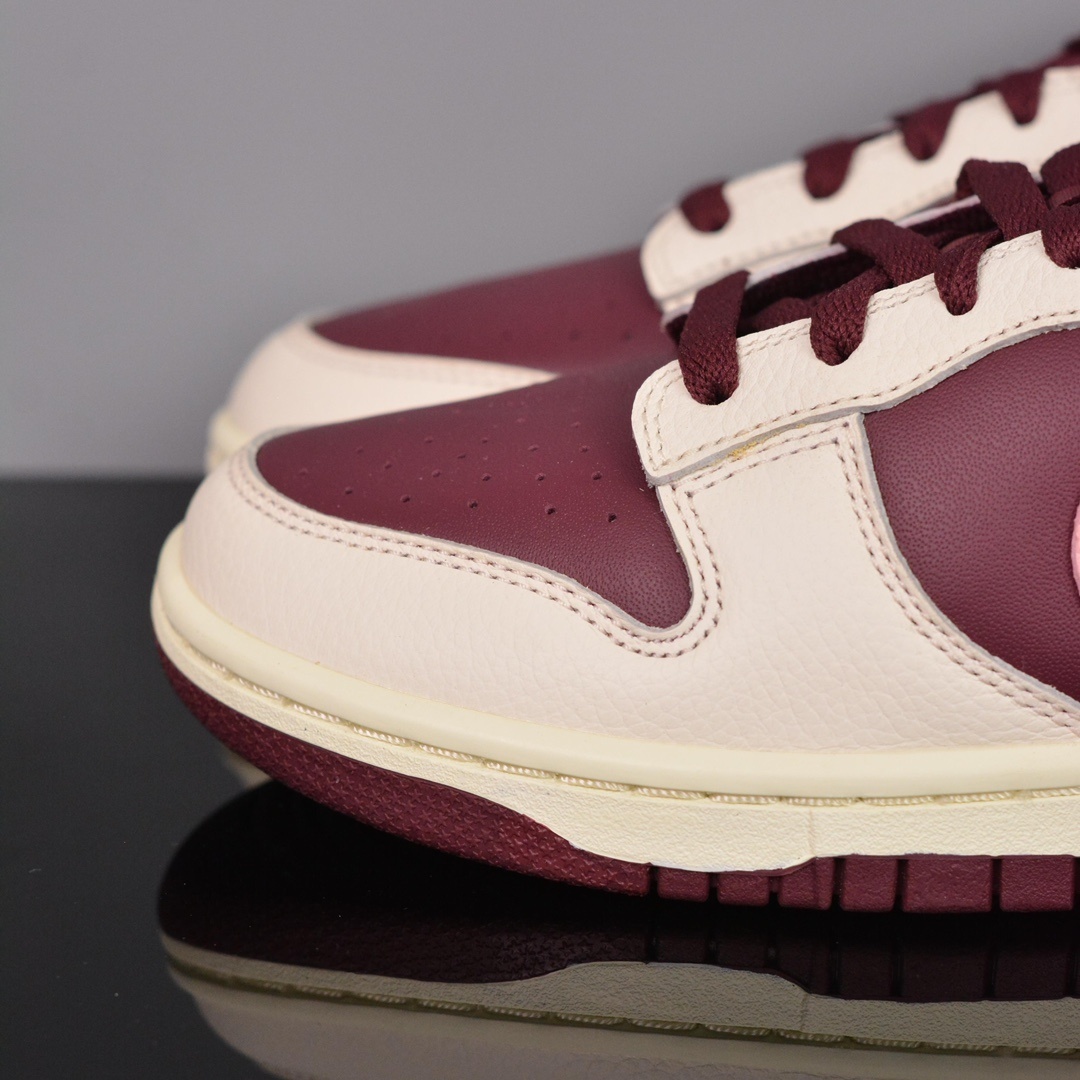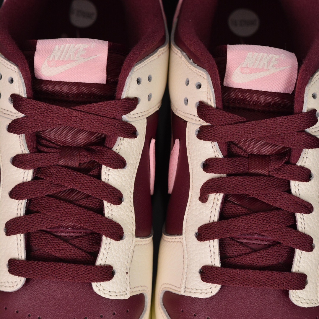 Vestido com um esquema de cores Pale Ivory, Medium Soft Pink e Night Maroon. Este Nike Dunk Low vem construído em couro com línguas de malha. Possui uma base Maroon com sobreposição e entressola Pale Ivory. Etiquetas de língua rosa, marca de palmilha, Swooshes e saltos em cima de uma sola de borracha Maroon completam o design.