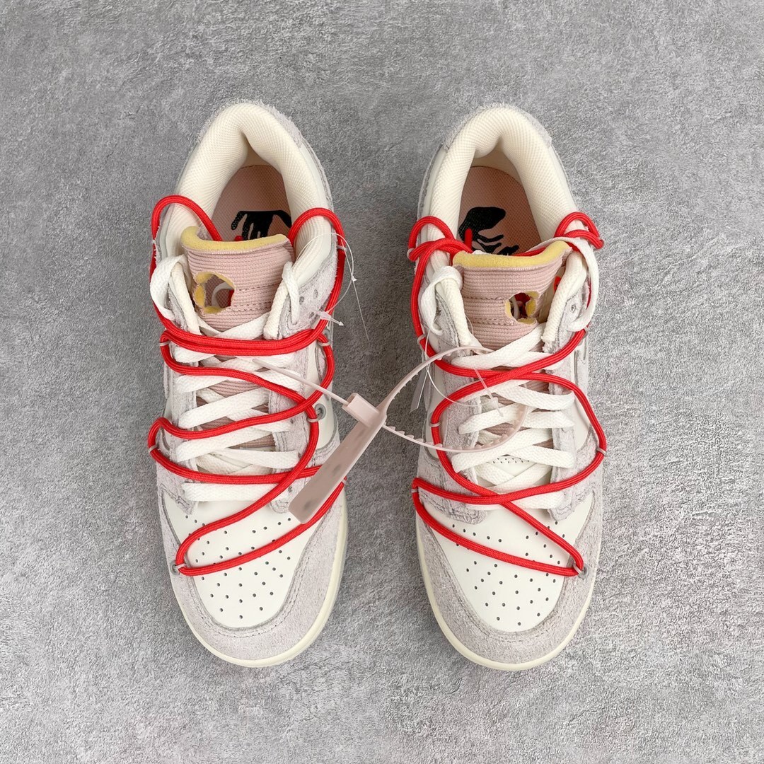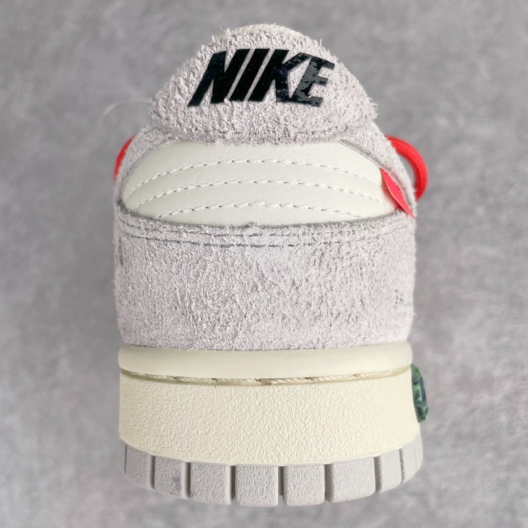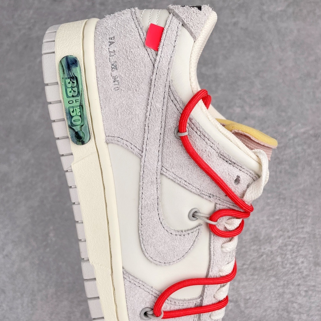 Este Off-White x Nike Dunk Low é retirado da coleção ‘Dear Summer’, uma continuação da primeira colaboração de Virgil Abloh com a Nike Dunk de 2019. O cano baixo usa uma parte superior de couro branco com sobreposições de lona cinza, junto com os detalhes do cartão de visita de Virgil Abloh, que incluem uma ziptie com zíper e um texto Helvética impresso. Picos contrastantes de cor chegam através do sistema de laço secundário do tênis, zíper, uma língua de espuma exposta e uma aba retangular afixada ao Swoosh. Limitado a cinquenta pares, um emblema ’30 de 50 ‘é afixado na entressola lateral.