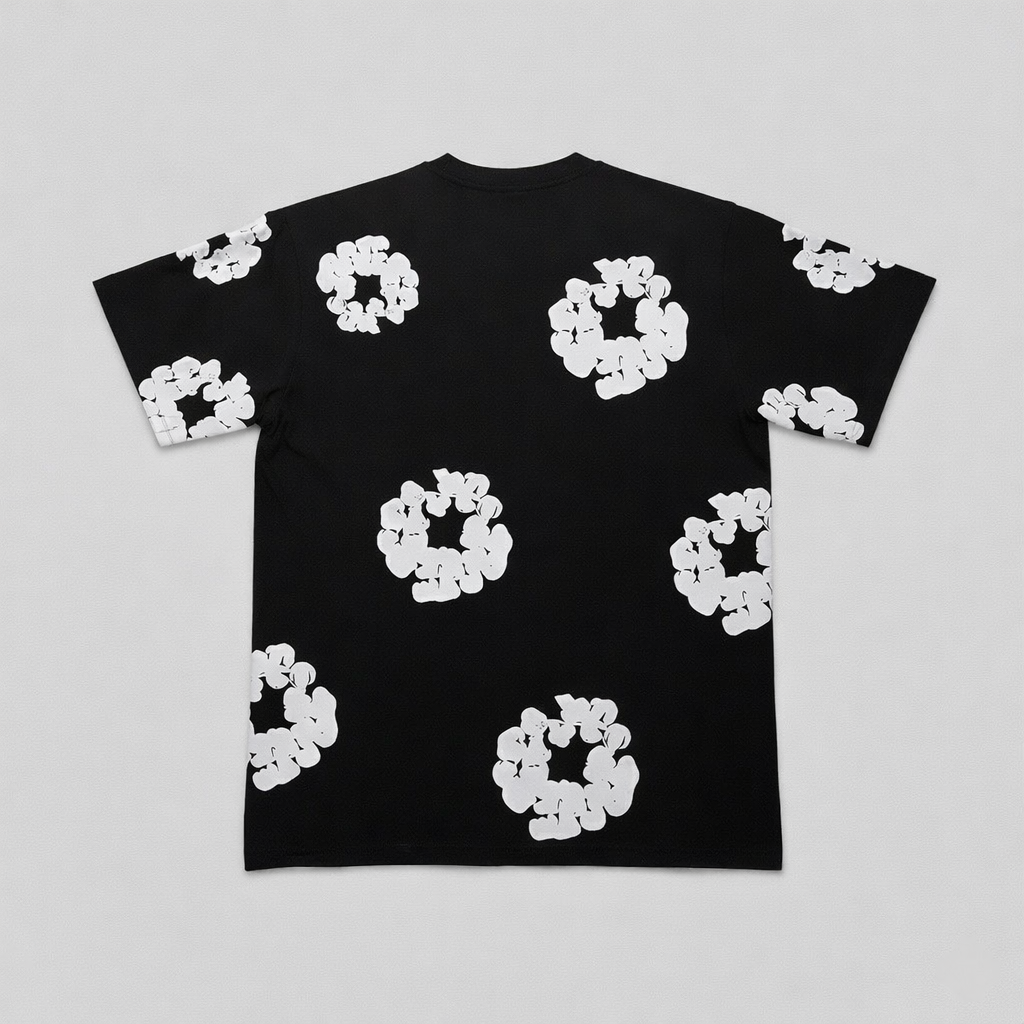 Iconografia Cotton Wreath: A estampa característica da marca, aplicada em contraste branco sobre o preto, simboliza a complexa história da diáspora e a herança da marca.